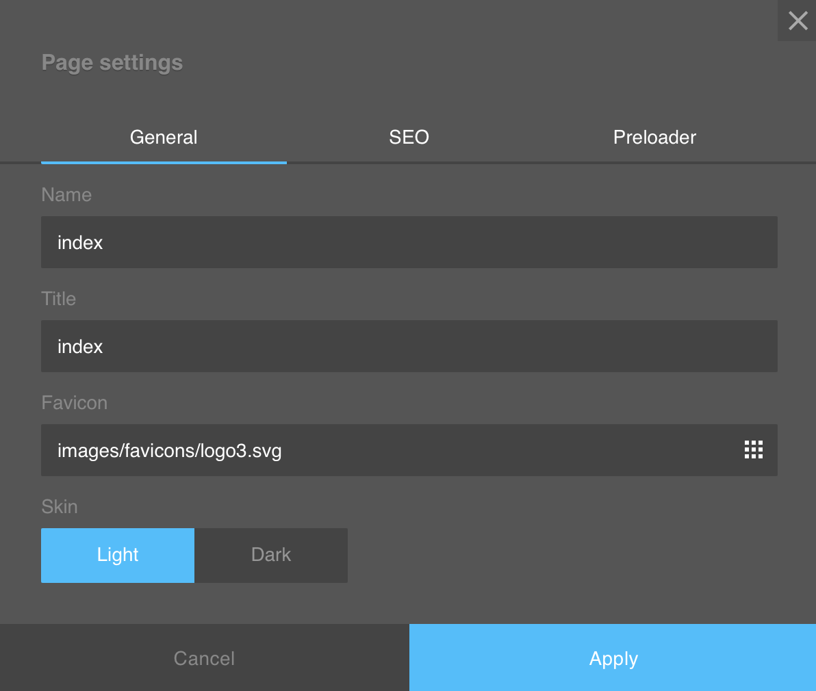 Clicking on the setting icon for a particuar page gives the following options changing the name of the page, it's title and the favicon for that page. we can also choose to change the default state of that page from light mode to dark mode.